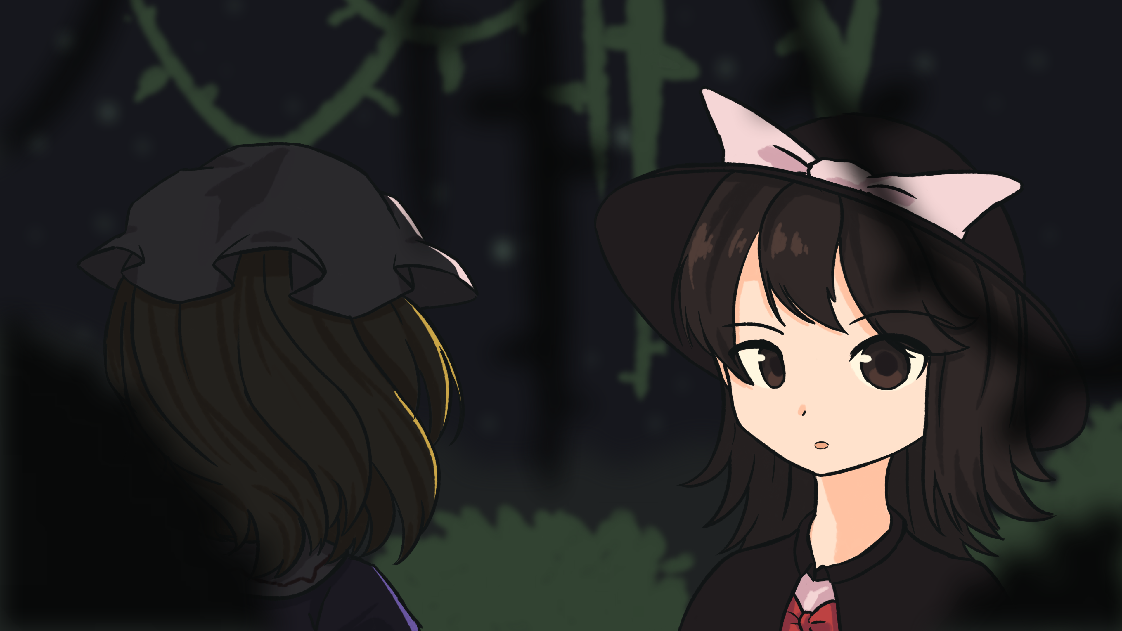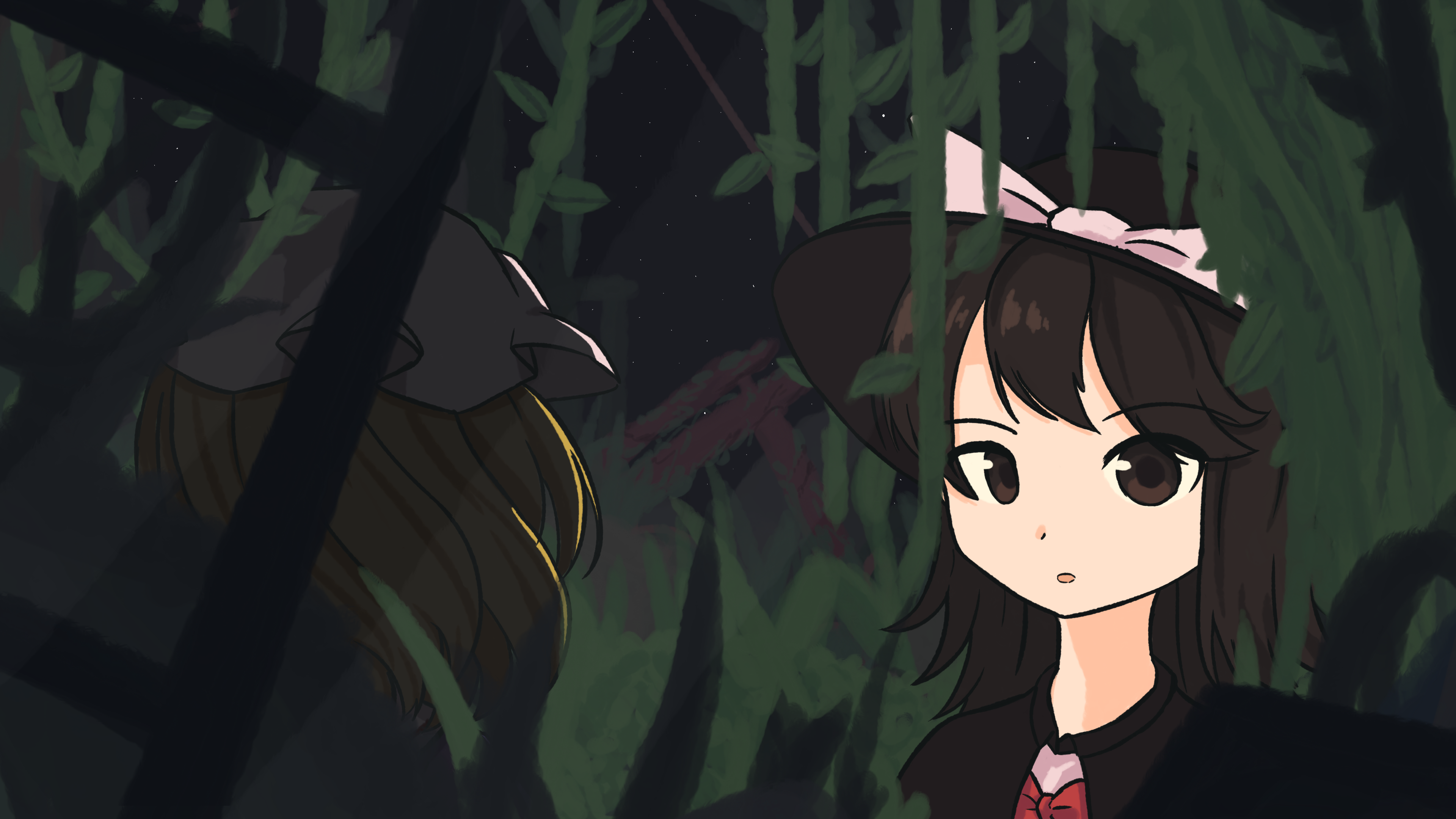 "green" is a drawing of Renko and Maribel in Satellite TORIFUNE from Trojan Green Asteroid. The background is filled with plant life, and there is also a torii gate near the horizon. Renko is lit and facing the camera, while Maribel is in darkness, facing away from the camera, and more obscured by the foreground objects.