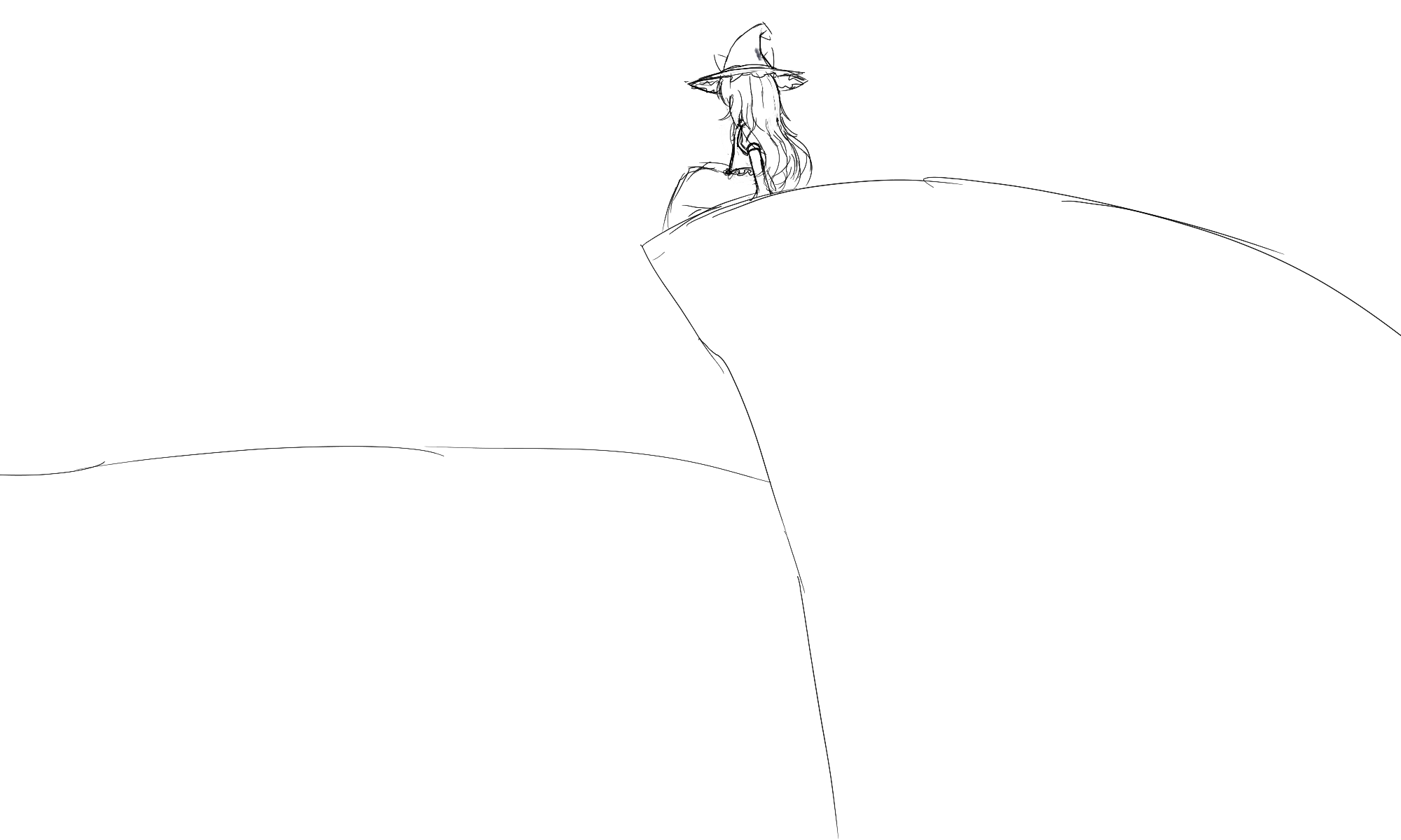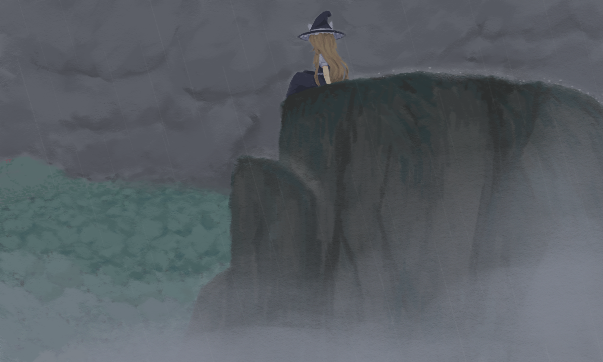 "melancholy" is a drawing of Marisa looking over a forest on top of a cliff during rainfall. The hill with the Hakurei Shrine can be seen in the distance.