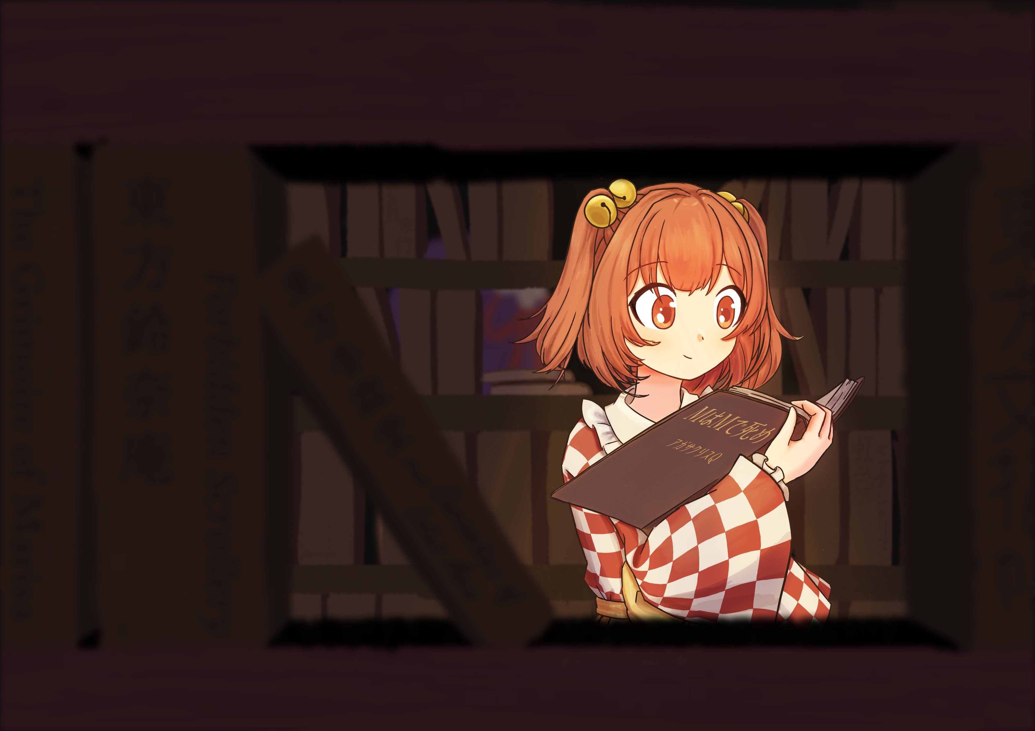 "suzunaan" is a drawing of Kosuzu reading "M dies of M" by Agatha Chris Q in a room full of bookshelves, with a light shining from the top. Akyuu can be seen behind another layer of bookshelves, mostly obscured. The shelves on the front and back are blurred, but the titles are as follows: