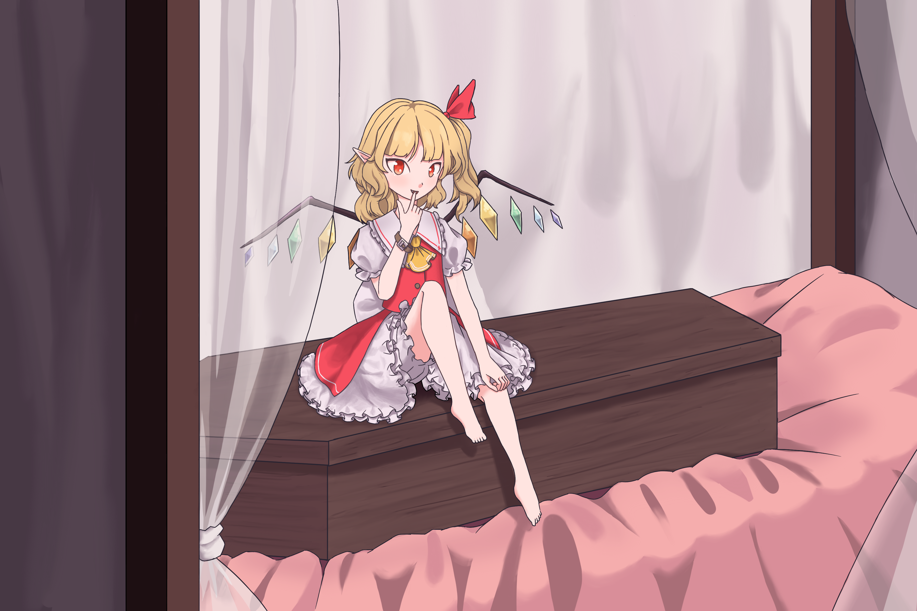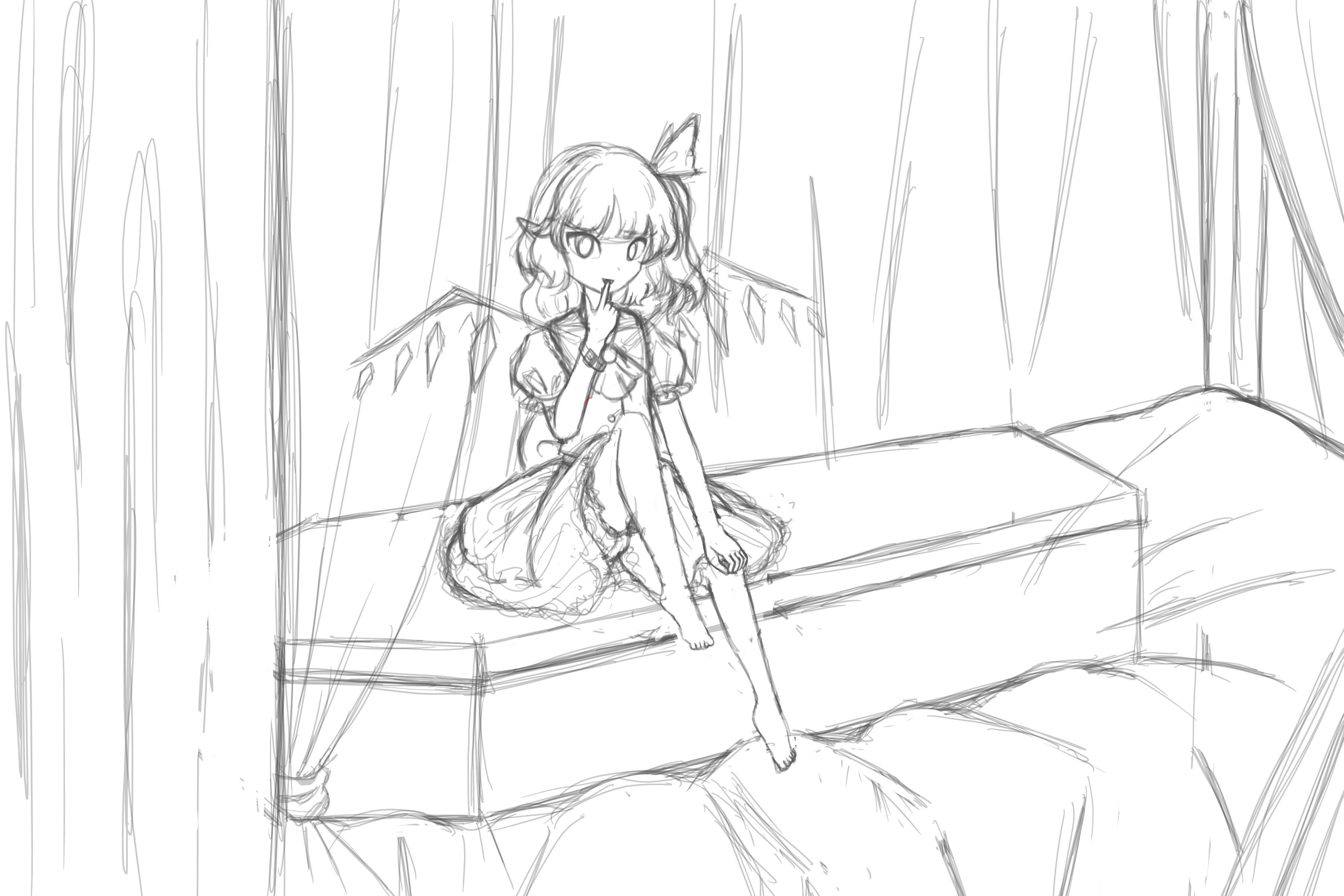 "visitor" is a drawing of Flandre sitting on a coffin on top of her bed in her room, inspired by the design from Foul Detective Satori.